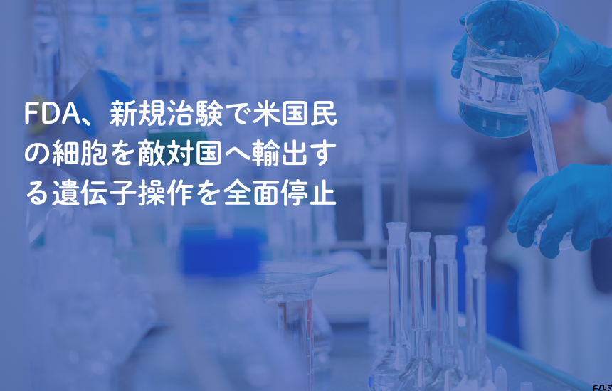 米国食品医薬品局(FDA)は、米国民の生きた細胞を中国などの敵対的とみなされる国に輸出し、現地で遺伝子操作を行った後に患者へ戻す形態の新規治験を即座に停止する方針を発表しました。