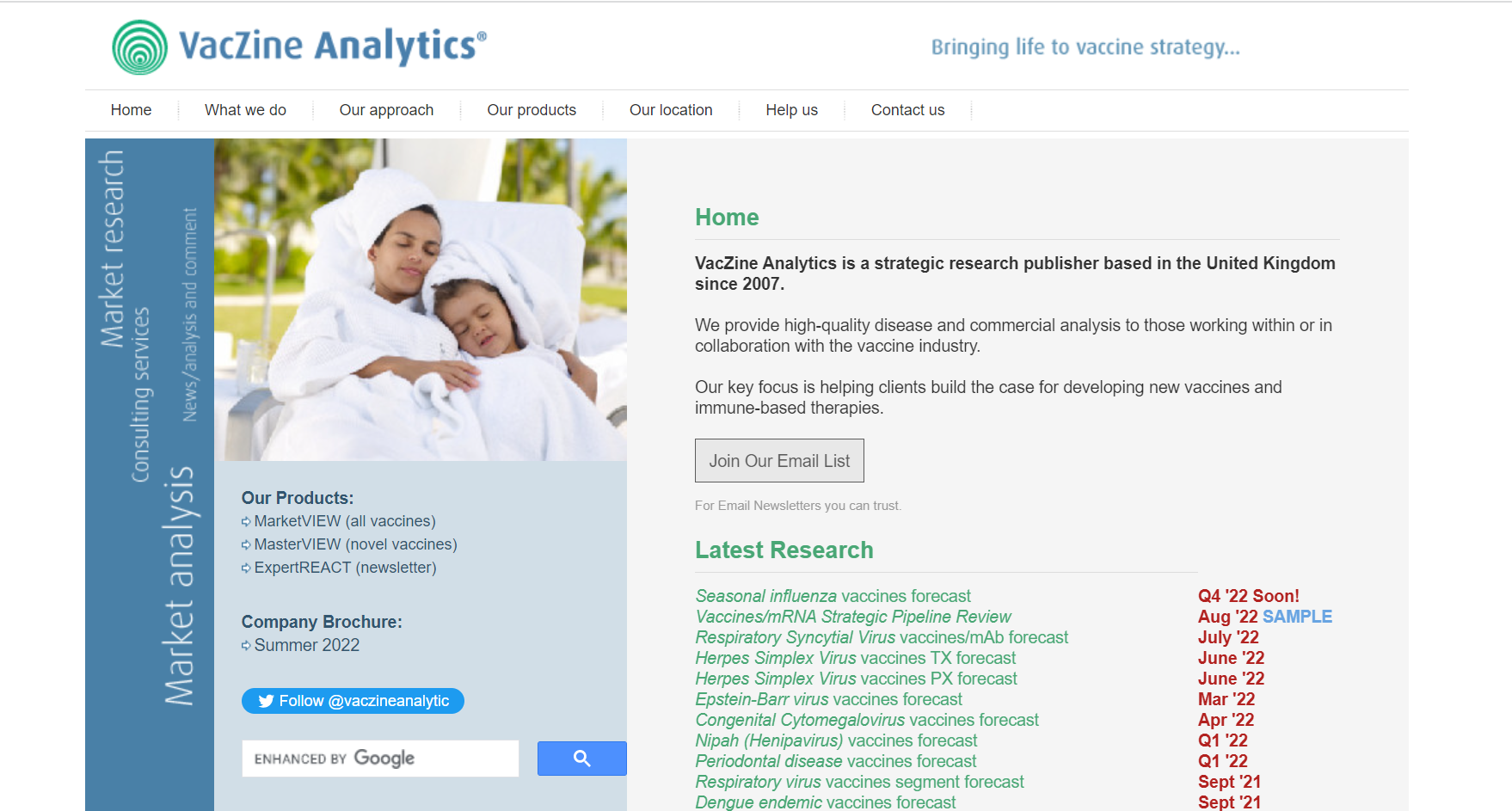 ワクチン特化で市場調査レポートを発行している英国の市場調査会社「ワクチンアナリティクス社」。ワクチンアナリティクスのレポートは、全世界のワクチン関連の製薬企業、団体、研究機関で活用されています。